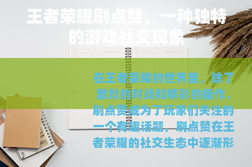 在王者荣耀的世界里,除了激烈的对战和精彩的操作,刷点赞成为了玩家们关注的一个有趣话题,刷点赞在王者荣耀的社交生态中逐渐形成了一种独特的现象,它为玩家们带来了别样的游戏体验和社交互动。