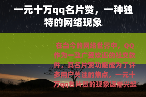 在当今的网络世界中,QQ作为一款广受欢迎的社交软件,其名片赞功能成为了许多用户关注的焦点,一元十万qq名片赞的现象逐渐兴起,引发了不少人的兴趣。