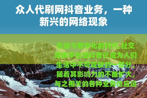 在当今数字化的时代,社交媒体平台如抖音已成为人们生活中不可或缺的一部分,随着其影响力的不断扩大,与之相关的各种业务也应运而生,其中众人代刷网抖音业务备受关注。