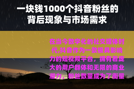 在当今数字化的社交媒体时代,抖音作为一款极具影响力的短视频平台,拥有着庞大的用户群体和无限的商业潜力,粉丝数量成为了衡量一个账号价值和影响力的重要指标之一,而“一块钱1000个抖音粉丝”这样的现象也随之悄然出现,引发了广泛的关注和讨论。