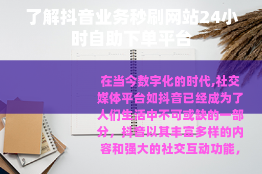 在当今数字化的时代,社交媒体平台如抖音已经成为了人们生活中不可或缺的一部分,抖音以其丰富多样的内容和强大的社交互动功能,吸引了数以亿计的用户,而随着抖音的火爆,与之相关的一些业务也应运而生,其中就包括抖音业务秒刷网站24小时自助下单平台。