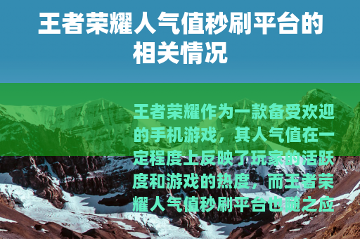 王者荣耀作为一款备受欢迎的手机游戏,其人气值在一定程度上反映了玩家的活跃度和游戏的热度,而王者荣耀人气值秒刷平台也随之应运而生,成为了一些玩家关注的焦点。