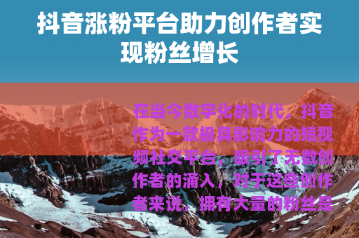 在当今数字化的时代,抖音作为一款极具影响力的短视频社交平台,吸引了无数创作者的涌入,对于这些创作者来说,拥有大量的粉丝是实现自身价值和商业变现的重要基础,而抖音涨粉平台的出现,为他们提供了一个新的途径来加速粉丝增长的进程。