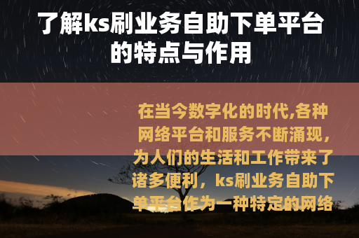 在当今数字化的时代,各种网络平台和服务不断涌现,为人们的生活和工作带来了诸多便利,ks刷业务自助下单平台作为一种特定的网络服务形式,受到了不少人的关注。
