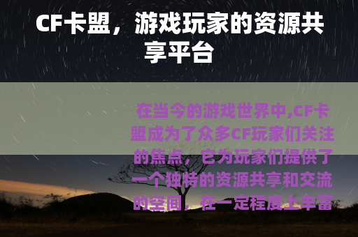 在当今的游戏世界中,CF卡盟成为了众多CF玩家们关注的焦点,它为玩家们提供了一个独特的资源共享和交流的空间,在一定程度上丰富了玩家们的游戏体验。