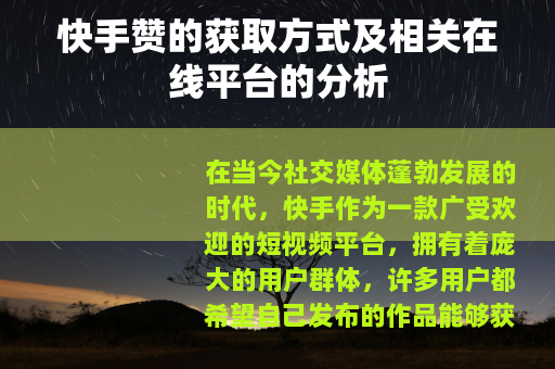 在当今社交媒体蓬勃发展的时代,快手作为一款广受欢迎的短视频平台,拥有着庞大的用户群体,许多用户都希望自己发布的作品能够获得更多的赞,以提高作品的曝光度和影响力,而在线刷快手赞的平台也随之应运而生,其中免费平台更是吸引了不少人的关注。