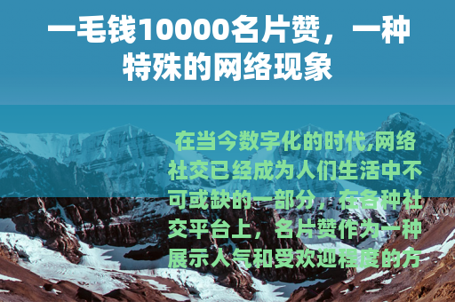 在当今数字化的时代,网络社交已经成为人们生活中不可或缺的一部分,在各种社交平台上,名片赞作为一种展示人气和受欢迎程度的方式,受到了许多人的关注,而“一毛钱10000名片赞”这样的现象也随之出现,引发了不少人的兴趣和讨论。
