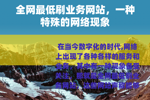 在当今数字化的时代,网络上出现了各种各样的服务和业务,其中有一种现象备受关注,那就是全网最低刷业务网站,这些网站声称能够以最低的价格为用户提供各种刷业务的服务,从社交媒体的粉丝数量、点赞评论量到网站的流量、排名等等,几乎涵盖了网络世界中所有可以量化的数据业务。