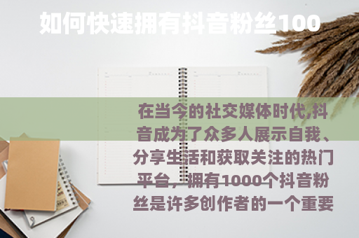 在当今的社交媒体时代,抖音成为了众多人展示自我、分享生活和获取关注的热门平台,拥有1000个抖音粉丝是许多创作者的一个重要目标,它不仅能让你的作品得到更多的曝光,还能开启一些抖音的特定功能,为你的创作之旅增添更多的可能性。