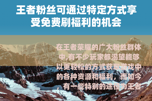 在王者荣耀的广大粉丝群体中,有不少玩家都渴望能够以更轻松的方式获取游戏中的各种资源和福利,而如今,有一些特别的途径为王者粉丝提供了免费刷的机会。
