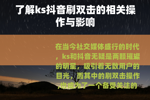 在当今社交媒体盛行的时代,ks和抖音无疑是两颗璀璨的明星,吸引着无数用户的目光,而其中的刷双击操作,也成为了一个备受关注的话题。