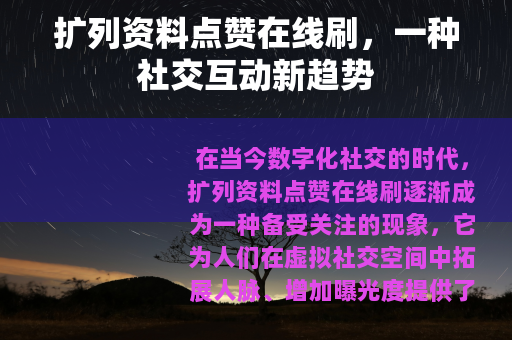 在当今数字化社交的时代,扩列资料点赞在线刷逐渐成为一种备受关注的现象,它为人们在虚拟社交空间中拓展人脉、增加曝光度提供了一种新的途径。