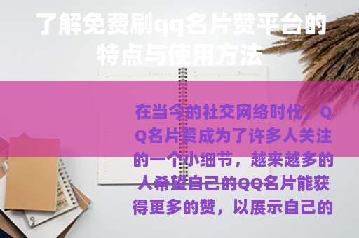 在当今的社交网络时代,QQ名片赞成为了许多人关注的一个小细节,越来越多的人希望自己的QQ名片能获得更多的赞,以展示自己的人气和魅力,而免费刷qq名片赞平台也随之应运而生,为广大QQ用户提供了一种快速增加名片赞的途径。