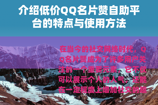 低价QQ名片赞自助平台以其价格低廉、操作简便、服务稳定等诸多优点,在QQ社交领域中占据了一席之地,它为广大用户提供了一个提升社交影响力、丰富社交生活的有效途径,在未来的发展中,随着技术的不断进步和用户需求的不断变化,相信这些平台将会不断创新和完善,为用户带来更多的惊喜和价值,用户在使用过程中,只要合理把握,充分发挥其优势,就能够在QQ社交的舞台上绽放出属于自己的光芒,收获更多的友谊和机会,让自己的社交之旅更加精彩和难忘。