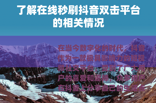 在当今数字化的时代,抖音作为一款极具影响力的短视频社交平台,受到了广大用户的喜爱和追捧,众多用户在抖音上分享自己的生活点滴、才艺表演等,希望能获得更多的关注和双击点赞,而随着抖音的火爆,一些在线秒刷抖音双击平台也应运而生。