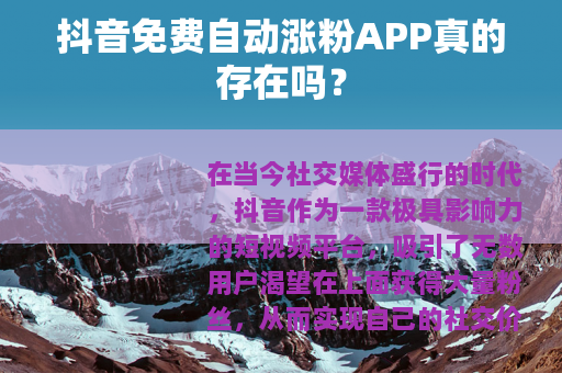 在当今社交媒体盛行的时代,抖音作为一款极具影响力的短视频平台,吸引了无数用户渴望在上面获得大量粉丝,从而实现自己的社交价值和商业目标,市场上出现了各种各样声称可以帮助抖音用户免费自动涨粉的APP,这让许多人眼前一亮,但这些APP真的靠谱吗?