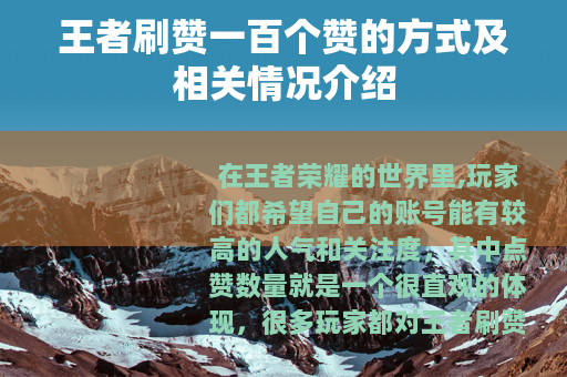 在王者荣耀的世界里,玩家们都希望自己的账号能有较高的人气和关注度,其中点赞数量就是一个很直观的体现,很多玩家都对王者刷赞一百个赞感兴趣,想知道如何能快速实现这一目标。