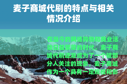 在当今的网络购物和商业活动日益繁荣的时代,麦子商城代刷逐渐成为了一个被部分人关注的现象,麦子商城作为一个具有一定规模和影响力的线上商城,其代刷业务也有着自身的特点和运作模式。