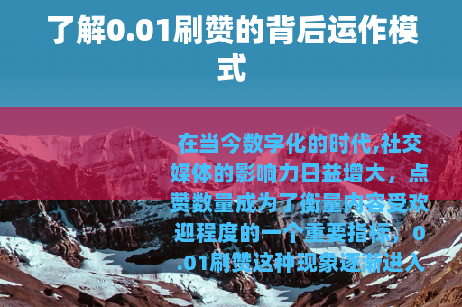 在当今数字化的时代,社交媒体的影响力日益增大,点赞数量成为了衡量内容受欢迎程度的一个重要指标,0.01刷赞这种现象逐渐进入了人们的视野。