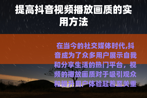 在当今的社交媒体时代,抖音成为了众多用户展示自我和分享生活的热门平台,视频的播放画质对于吸引观众和提升用户体验起着至关重要的作用,如何提高抖音视频播放画质呢?以下是一些实用的方法。