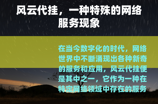 在当今数字化的时代,网络世界中不断涌现出各种新奇的服务和应用,风云代挂便是其中之一,它作为一种在特定网络领域中存在的服务模式,逐渐引起了人们的关注。