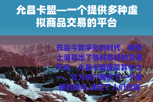 在当今数字化的时代,网络上涌现出了各种各样的交易平台,允昌卡盟便是其中之一,它为用户提供了一个便捷的场所,满足了人们在虚拟商品交易方面的诸多需求。