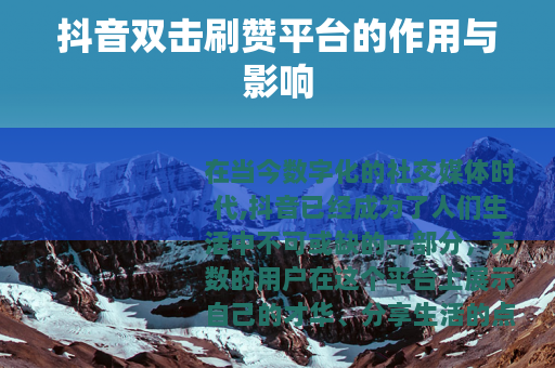 在当今数字化的社交媒体时代,抖音已经成为了人们生活中不可或缺的一部分,无数的用户在这个平台上展示自己的才华、分享生活的点滴,希望能够获得更多的关注和认可,而抖音双击刷赞平台也随之应运而生,它在抖音的生态中扮演着独特的角色,有着多方面的作用与影响。