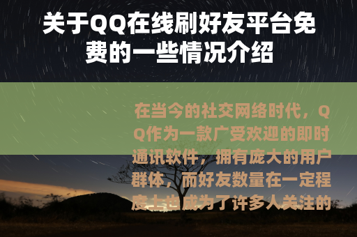 在当今的社交网络时代,QQ作为一款广受欢迎的即时通讯软件,拥有庞大的用户群体,而好友数量在一定程度上也成为了许多人关注的一个点,于是便出现了所谓的QQ在线刷好友平台免费这样的服务。