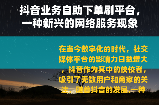 在当今数字化的时代,社交媒体平台的影响力日益增大,抖音作为其中的佼佼者,吸引了无数用户和商家的关注,随着抖音的发展,一种名为抖音业务自助下单刷平台的服务也逐渐兴起。