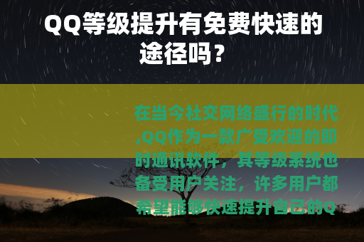 在当今社交网络盛行的时代,QQ作为一款广受欢迎的即时通讯软件,其等级系统也备受用户关注,许多用户都希望能够快速提升自己的QQ等级,以展示自己在QQ世界中的活跃度和资历,网络上出现了一些声称可以免费快速刷QQ等级的网站,吸引了不少人的目光。