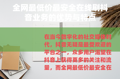 在当今数字化的社交媒体时代,抖音无疑是最受欢迎的平台之一,众多用户渴望在抖音上获得更多的关注和流量,而全网最低价最安全在线刷抖音业务也随之应运而生,为用户提供了一种提升抖音账号影响力的新途径。