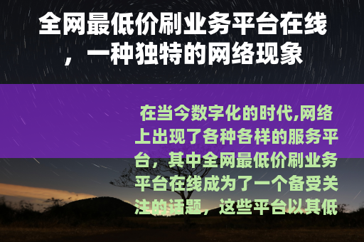 在当今数字化的时代,网络上出现了各种各样的服务平台,其中全网最低价刷业务平台在线成为了一个备受关注的话题,这些平台以其低廉的价格和丰富的业务种类吸引了众多用户的目光。