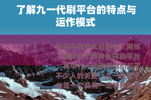 在当今数字化的时代,网络上涌现出了各种各样的平台,其中九一代刷平台引起了不少人的关注,九一代刷平台是一个具有一定特色的网络服务平台,它在特定的网络领域中有着自己的一套运作方式。