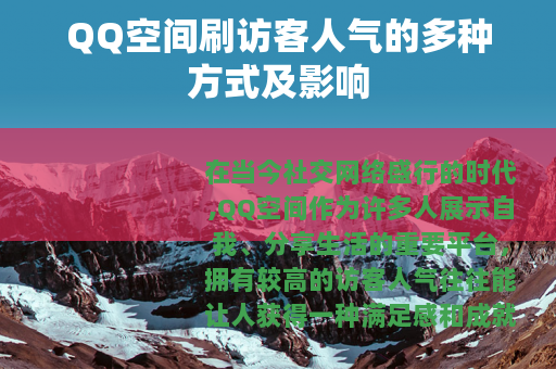 在当今社交网络盛行的时代,QQ空间作为许多人展示自我、分享生活的重要平台,拥有较高的访客人气往往能让人获得一种满足感和成就感,QQ空间刷访客人气的现象应运而生,并且存在着多种不同的方式。