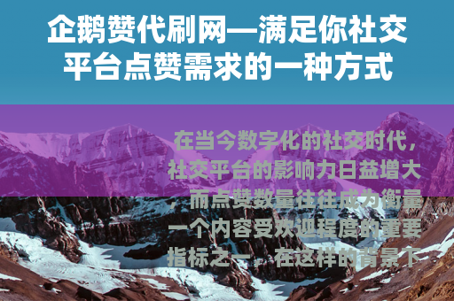在当今数字化的社交时代,社交平台的影响力日益增大,而点赞数量往往成为衡量一个内容受欢迎程度的重要指标之一,在这样的背景下,企鹅赞代刷网应运而生,为许多用户提供了一种获取更多点赞的途径。