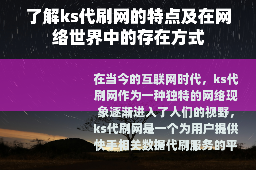 在当今的互联网时代,ks代刷网作为一种独特的网络现象逐渐进入了人们的视野,ks代刷网是一个为用户提供快手相关数据代刷服务的平台,它在网络世界中有着自己的一套运营模式和用户群体。