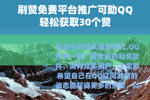 在当今的社交网络时代,QQ作为一款广受欢迎的社交软件,拥有众多用户,大家都希望自己在QQ空间发布的动态能获得更多的点赞,以此来展示自己的人气和受欢迎程度,而刷赞免费平台的出现,为许多人提供了一种快速获取赞的途径。