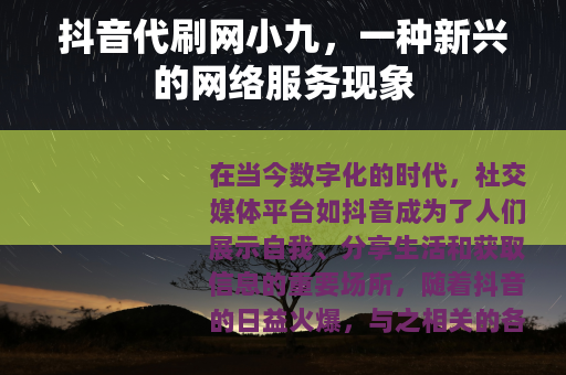 在当今数字化的时代,社交媒体平台如抖音成为了人们展示自我、分享生活和获取信息的重要场所,随着抖音的日益火爆,与之相关的各类服务也应运而生,其中抖音代刷网小九就是备受关注的一种。