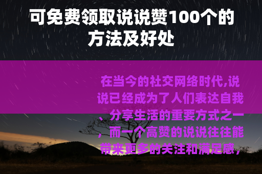 在当今的社交网络时代,说说已经成为了人们表达自我、分享生活的重要方式之一,而一个高赞的说说往往能带来更多的关注和满足感,就来给大家介绍一种可以免费领取说说赞100个的途径及其诸多好处。