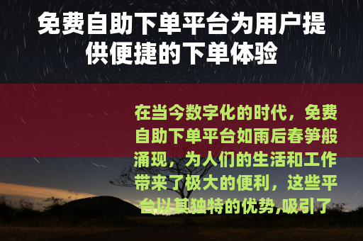 在当今数字化的时代,免费自助下单平台如雨后春笋般涌现,为人们的生活和工作带来了极大的便利,这些平台以其独特的优势,吸引了众多用户的关注和使用。