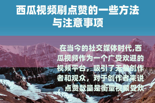 在当今的社交媒体时代,西瓜视频作为一个广受欢迎的视频平台,吸引了无数创作者和观众,对于创作者来说,点赞数量是衡量视频受欢迎程度的一个重要指标,很多人都希望能够提高自己视频的点赞量,在这篇文章中,我们将探讨一些关于西瓜视频刷点赞的相关内容。