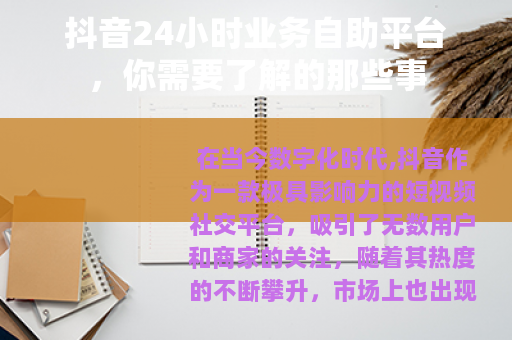 在当今数字化时代,抖音作为一款极具影响力的短视频社交平台,吸引了无数用户和商家的关注,随着其热度的不断攀升,市场上也出现了各种各样声称能提供抖音24小时业务自助服务的平台。