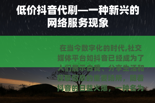 在当今数字化的时代,社交媒体平台如抖音已经成为了人们展示自我、分享生活和获取信息的重要场所,随着抖音的日益火爆,一种名为“低价抖音代刷”的服务也悄然兴起,吸引了众多用户的关注。