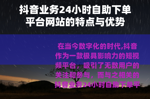 在当今数字化的时代,抖音作为一款极具影响力的短视频平台,吸引了无数用户的关注和参与,而与之相关的抖音业务24小时自助下单平台网站也应运而生,为众多抖音用户提供了便利和多样的服务。