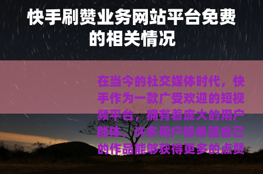 在当今的社交媒体时代,快手作为一款广受欢迎的短视频平台,拥有着庞大的用户群体,许多用户都希望自己的作品能够获得更多的点赞,从而提高曝光度和人气,在这种需求下,快手刷赞业务网站平台免费的现象应运而生。