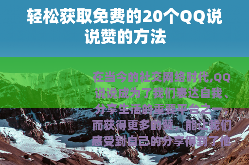 通过以上这些方法的综合运用,相信你能够轻松地获得免费的20个QQ说说赞,在这个过程中,你不仅能够收获更多的赞,还能增进与好友之间的感情,扩大自己的社交圈子,让自己的QQ空间变得更加热闹和有活力,让我们一起努力,让自己的说说在QQ空间中绽放出更加耀眼的光芒,赢得更多的关注和喜爱吧。