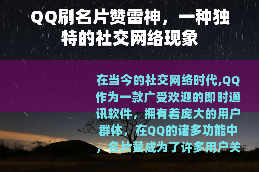 在当今的社交网络时代,QQ作为一款广受欢迎的即时通讯软件,拥有着庞大的用户群体,在QQ的诸多功能中,名片赞成为了许多用户关注的一个点,而“QQ刷名片赞雷神”也随之应运而生,成为了一个独特的社交网络现象。