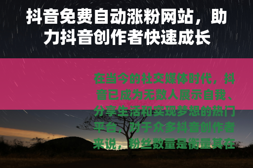 在当今的社交媒体时代,抖音已成为无数人展示自我、分享生活和实现梦想的热门平台,对于众多抖音创作者来说,粉丝数量是衡量其在平台上影响力和成功与否的重要指标之一,许多人都在寻找各种方法来增加自己的粉丝量,而抖音免费自动涨粉网站便应运而生,为创作者们提供了一种新的途径和可能。