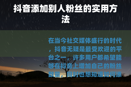 在当今社交媒体盛行的时代,抖音无疑是最受欢迎的平台之一,许多用户都希望能够在抖音上增加自己的粉丝数量,同时也想知道如何添加别人粉丝,以下是一些在抖音添加别人粉丝的有效方法。