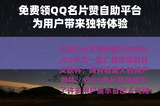 在当今社交网络盛行的时代,QQ作为一款广受欢迎的社交软件,拥有着庞大的用户群体,而QQ名片赞则成为了许多用户展示自己人气和魅力的一种方式,在这样的背景下,免费领QQ名片赞自助平台应运而生,为广大QQ用户提供了一个便捷获取名片赞的途径。